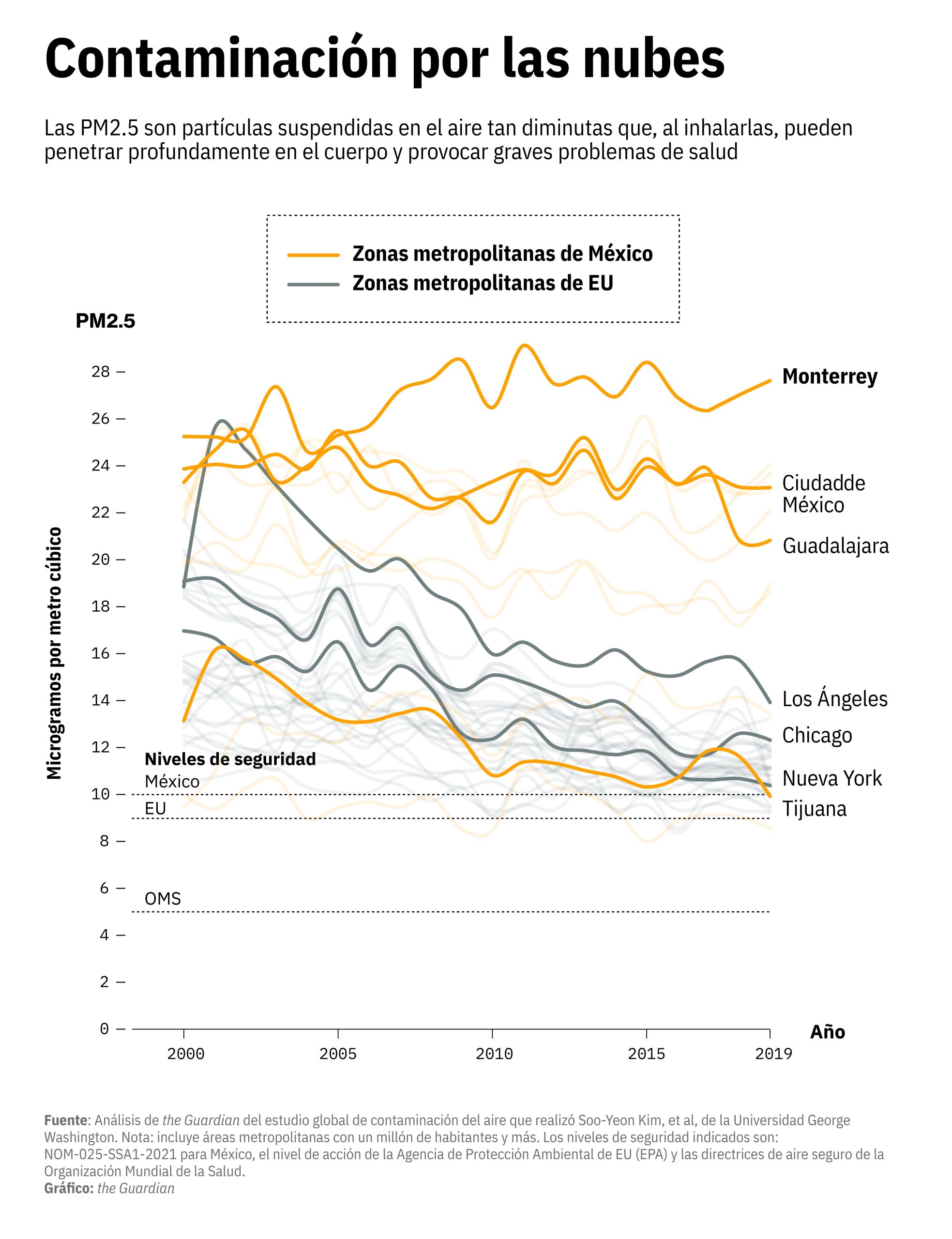 El promedio anual de PM2.5 en Nuevo León fue de 20 microgramos por metro cúbico. Esta cifra duplica el límite permitido por las normas mexicanas y cuadruplica las recomendaciones de organismos internacionales. El exceso confirma que la contaminación del aire tiene un impacto acumulativo que afecta a toda la población.